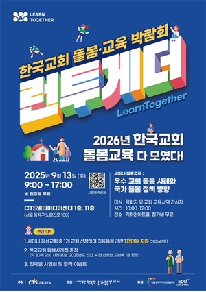 CTS기독교TV(회장 감경철, 이하 CTS)와 행복한출생 든든한미래(이하 행복한미래)는 한국교회의 돌봄사역 확산을 통해 저출생 문제를 극복하고자 ‘런투게더(LearnTogether) 한국교회 교육·돌봄 박람회’를 개최한다.이번 박람회는 20여 년간 CTS가 이어온 다음세대 부흥과 저출생 극복 사역의 일환이다. 이번 박람회는 지난 1월 공포된 국토교통부령 제1439호에 따라 ‘용도변경 없이 종교시설 내 아동돌봄 사역이 가능’해짐에 따라 전국의 종교시설이 돌봄 사역을 효과적으로 진행할 수 있도록 돕는 실제적 정보 제공의 자리가 될 것이