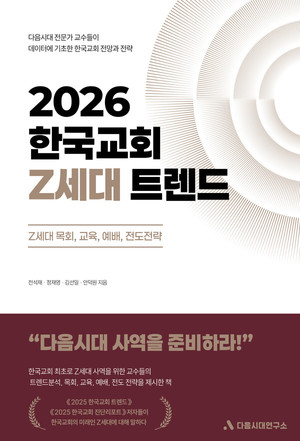 Z세대(18~28세)의 10명 중 8명이 ‘교회를 신뢰하지 않는다’는 조사 결과가 나왔다. 교회 내에서도 이들은 참여도와 제자훈련 기회에서 가장 낮은 수준을 보이며 신앙 성장에 어려움을 겪고 있는 것으로 나타났다. 디지털 세대의 변화된 감수성과 세계관에 적절히 대응하지 못한다면, 한국교회는 다음세대와의 단절을 피하기 어렵다는 우려가 커지고 있다.이러한 문제의식 속에, 《2026 한국교회 Z세대 트렌드: Z세대 목회·교육·예배·전도 전략》이 출간됐다. 지난해 발간된 《2025 Z세대 트렌드와 한국교회》의 후속작으로, 이번 책은 Z세대