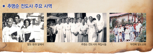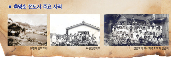 김용은 목사의 지원을 받게 된 추명순 전도사는 1970년대 중반까지 20여 년간 8개의 교회를 세웠다. 새로 개척한 곳도 있고, 문 닫은 교회를 다시 살려내기도 했다. 당시 섬을 장악했던 무당들의 방해와 협박으로 목숨이 위태로울 때도 있었다.
