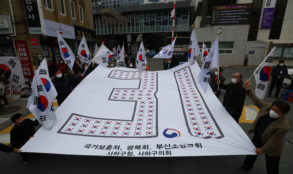 3.1절 102주년을 기념하며 원승재 원로목사(부산소망교회)와 성도, 광복회 회원, 사하구의원 등이 지난 2월 25일 부산 사하구청 앞에서 3.1 독립만세운동을 재현하는 퍼포먼스를 펼쳤다.