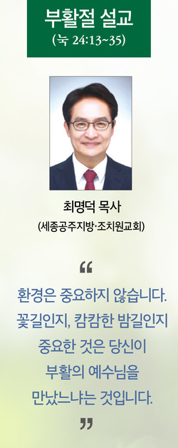 환경은 중요하지 않습니다. 꽃길인지, 캄캄한 밤길인지가 중요하지 않습니다. 중요한 것은 당신이 부활의 예수님을 만났느냐는 것입니다. 엠마오로 내려가던 두 제자가 부활의 예수님을 만났을 때 캄캄한 밤길임에도 불구하고 환희와 소망 속에서 예루살렘으로 올라갔던 것처럼, 부활의 주님을 만날 때 인생이 변화됩니다.