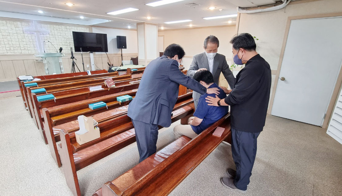 지 총회장은 말씀을 전한 후 정재학 목사, 최문상 목사와 함께 류호영 목사에게 안수하고 치유를 위해 간절히 기도했다.