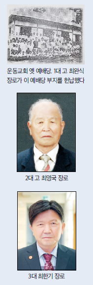 1대 최완식 장로로부터 3代가 장로로 사명을 다하고 있다. 1대 고 최완식 장로는 1932년 복음을 듣고 교회에 출석했으며, 운동교회의 개척부터 함께하여 해방 후인 1946년 장로로 장립했다.