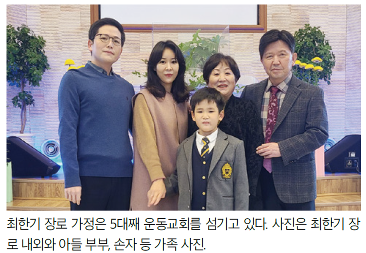 이런 유서 깊은 운동교회에 5대를 이어 섬기는 ‘신앙의 명문가’가 있다. 바로 최한기 장로의 가정이 그 주인공이다.