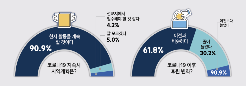 그러나 파송 기관에서 코로나에 대비하거나 이전보다 후원금이 줄어드는 등 보다 근본적인 대책이 필요한 것으로 나타났다.