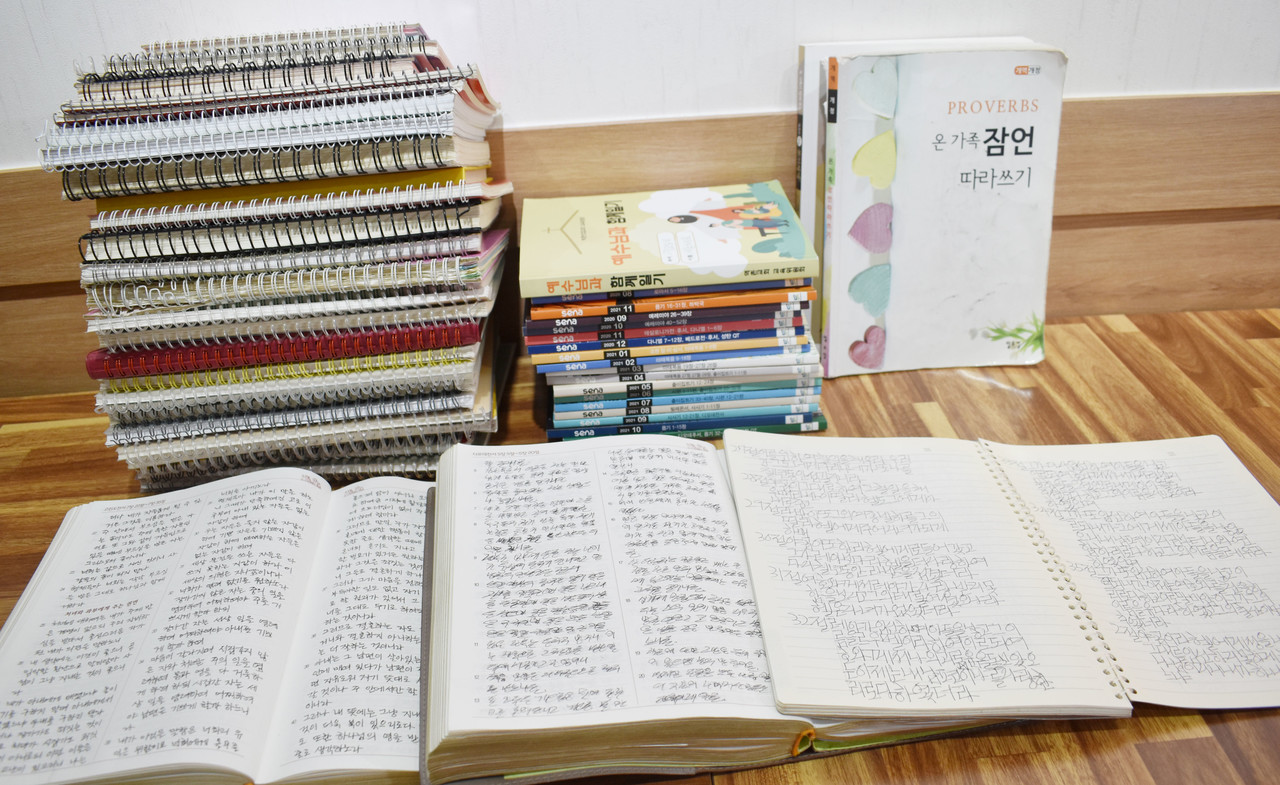 매일 이렇게 성경을 쓰다 보니 세은 씨가 쓴 구약 필사본과 성경 노트, 큐티집은 그녀의 키만큼이나 쌓였다.