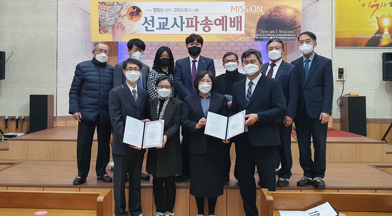 이어 오강석 목사와 안수위원 등이 파송되는 선교사들의 머리에 손을 얹고 안수 기도를 했으며, 오 목사가 선교사들에게 파송장을 전달했다.