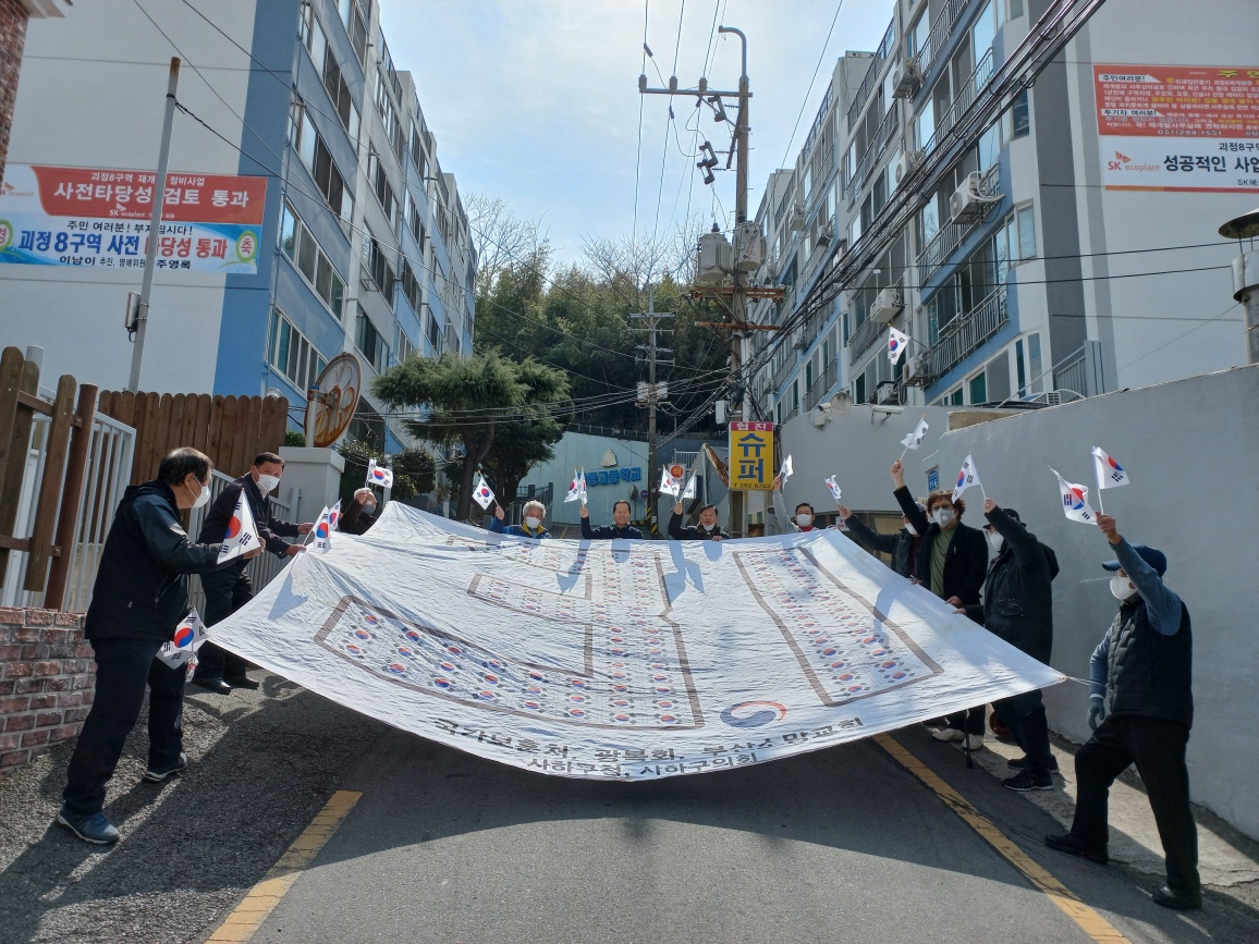 원승재 목사(부산소망교회 원로)와 광복회(지부장 김경련) 회원 가족, 국가유공자(지부장 조규남) 회원들은 지난 2월 28일 부산 사하구 보훈회관 앞에서 103개 태극기가 새겨진 길이 7m, 폭 5m의 3.1절 현수막과 태극기를 들고 원승재 목사의 제창으로 “대한민국 만세”를 부르는 퍼포먼스를 펼쳤다.