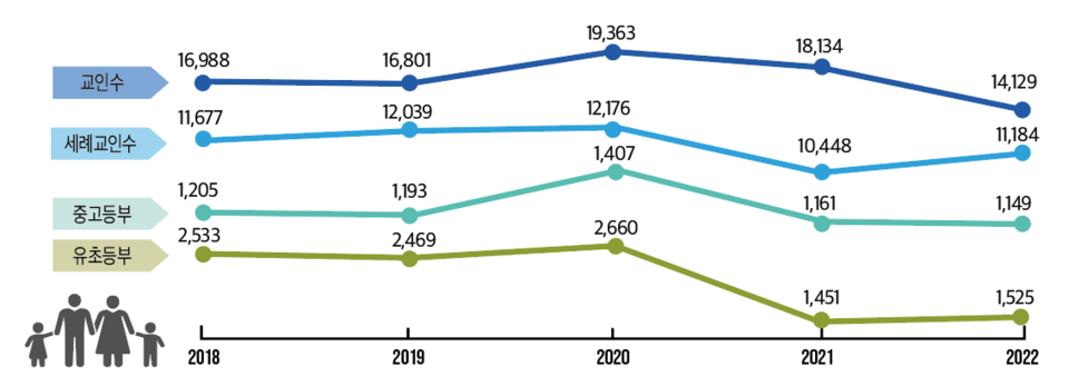 유초등부는 2017년 2,071명으로 2,000명을 넘긴 후 2018년 2,533명, 2019년 2,469명을 기록하고 2020년 2,660명으로 보고되면서 정점을 찍은 후 지난 해 보고에서는 1,451명으로 급감했다. 그러나 올해는 1,525명으로 오히려 늘었다.