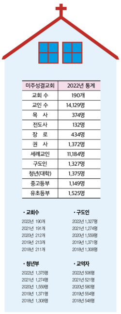 미주총회가 최근 발표한 교세통계에 따르면 2021년 현재 미주성결교회의 수는 190개, 교인 수는 14,729명이다. 통계상으로 보면 전년에 비해 교회는 1개, 교인 수는 3,405명이 줄어든 수치이다. 남미지방회가 2021년부터 한인교회만 집계하고 중남부지방회의 수치를 지난 해와 똑같이 적용했다고 해도 1년 만에 3,000명 이상이 줄어든 것은 코로나의 영향 때문인 것으로 분석된다.