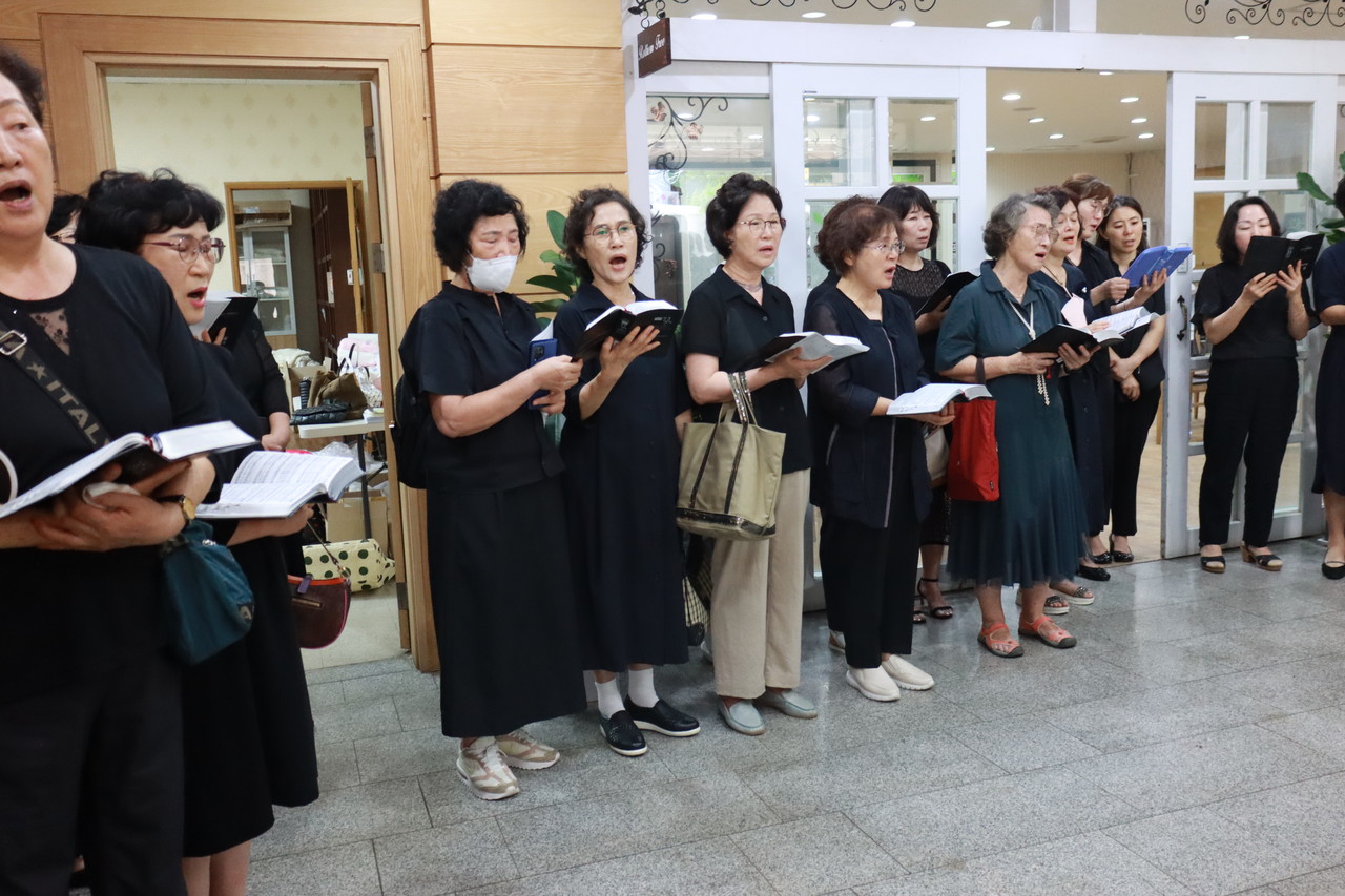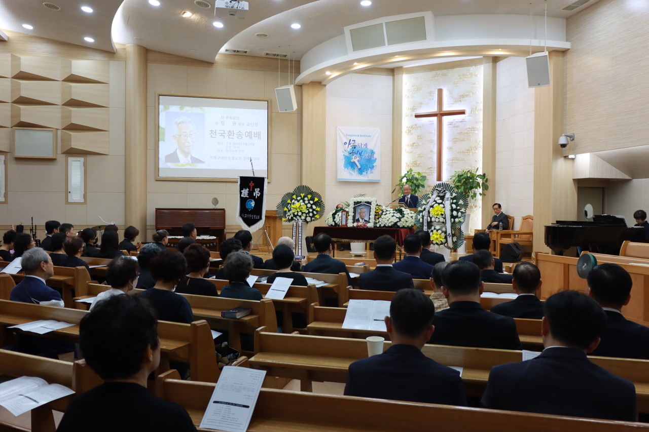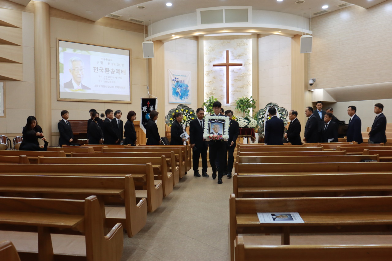 박보영 전도사는 트럼펫으로 조가를 연주했고, 인사와 광고를 전한 이인한 목사는 “신앙의 동지로 평생 장로님과 함께할 수 있었기에 감사의 마음을 전한다. 떠나신 자리가 한동안 아쉬움과 슬픔으로 눈에 밟힐 것 같다”며 눈물을 삼켰다. 이어 “유족과 남천교회 성도들은 장로님의 가르침과 삶을 본받아 주님 앞에 다시 뵐 때까지 교회를 잘 섬기겠다”고 다짐했다. 이날 장례예배는 고별 묵념 후 전 총회장 이재완 목사의 축도로 모두 마쳤다.