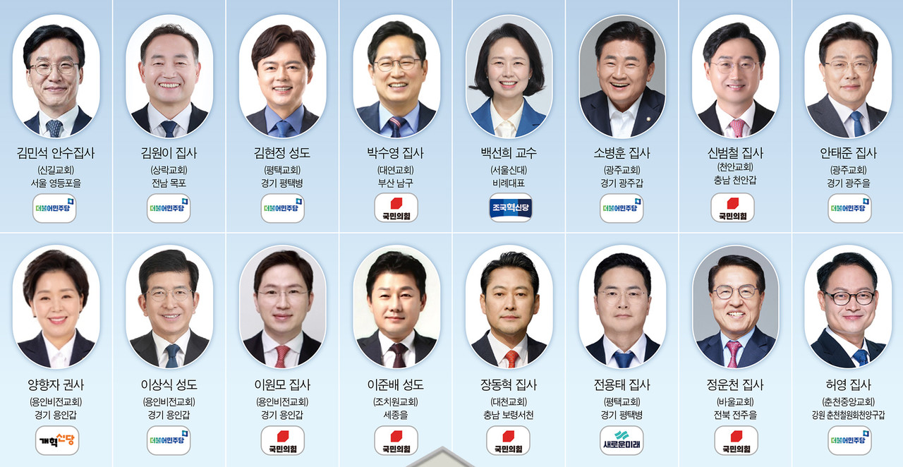 안태준 집사(광주교회)는 경기 광주을 선거에 더불어민주당 후보로 출마해 초선을 노린다. 안 집사는 성남산업진흥재단 이사, GH경기주택도시공사 사장 직무대행을 역임했다. 이재명 대표 취임 이후 더불어민주당 대표 정무특보, 대변인으로 활동했다. 이준배 성도(조치원교회)는 국민의힘 후보로 세종을 지역에 출마했다. 이 후보는 세종시 전 경제부시장을 역임했으며 세종미래전략연구원 원장으로 활동하고 있다. 서울신대 백선희 교수도 조국혁신당 비례대표로 처음 정치에 나섰다. 백 교수는 서울신대 사회복지대학원장을 비롯해 2004년 대통령 자문위원회였던 고령화 및 미래사회위원회 전문위원과 육아정책연구소 5대 소장을 맡은 바 있다.