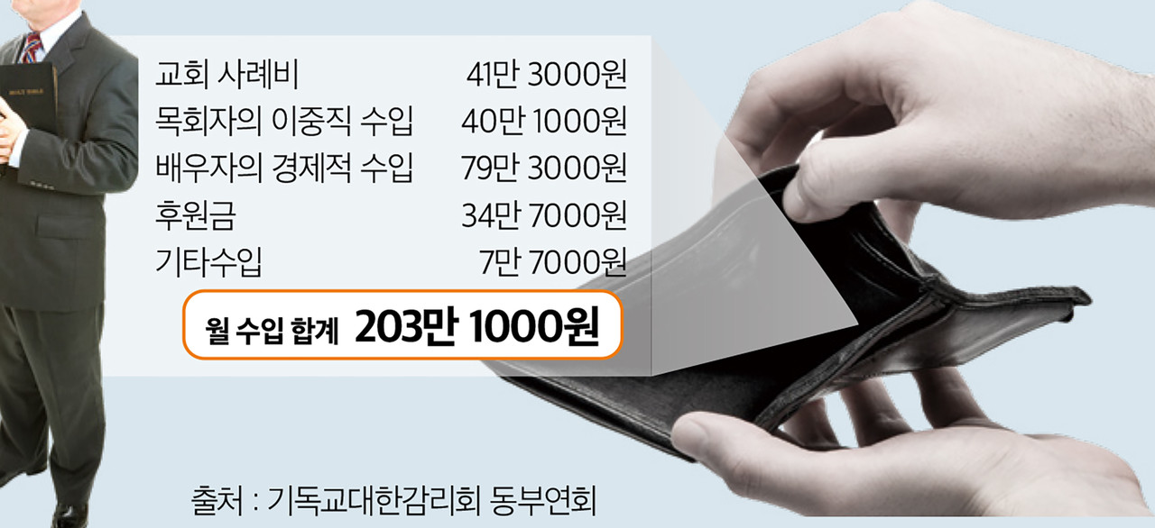 조사 결과에 따르면 총 245명의 목회자 중 88명이 미자립교회로 이들 가정의 평균 수입은 203만 1000원이었다. 이중 교회 사례비는 41만 3000원이었으며 이중직 수입은 40만 1000원으로 목회자 혼자만의 월 수입은 81만 4000원이었다. 나머지는 배우자의 경제적 수입(79만 3000원), 후원금(34만 7000원), 지방회 및 연회, 본부 지원금(5만 3000원) 등이었다. 이는 2024년 1인당 최저임금(주 40시간 기준) 206만 740원 보다도 낮은 수준이다.