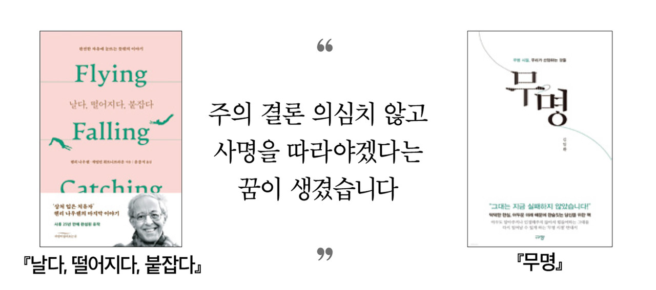 두 권의 책은 서로에게 질문하고 또 서로에게 대답합니다. 그래서 이번 글은 무명 의 목차에 따라 날다, 떨어진다, 붙잡다 의 내용을 연결해서 책을 소개하고자 합니다.