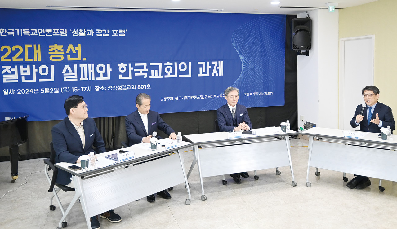 한국기독교언론포럼과 한국기독교목회자협의회는 지난 5월 2일 성락성결교회에서 ‘22대 총선, 절반의 실패와 한국교회의 과제’를 주제로 포럼을 개최했다. 임성빈 전 장신대 총장이 사회를 맡고 변상욱 전 CBS 대기자, 지형은 목사(성락성결교회), 민경중 교수(한국외대 초빙교수)가 토론자로 나섰다.