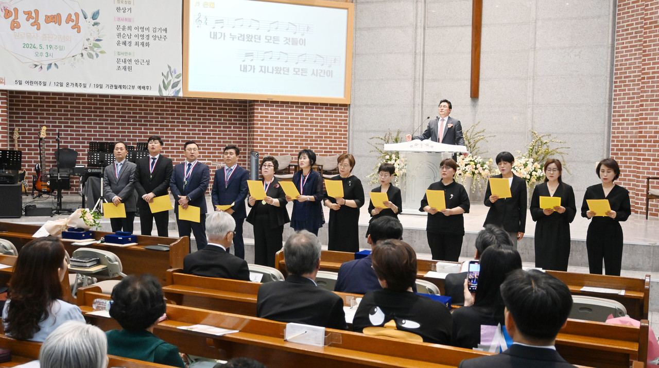 이어 임직식을 열고 장로장립, 권사취임, 집사안수 예식이 차례로 진행됐다. 임직자들은 서약을 통해 교역자를 도와 교회를 세워가며 성도들에게 신앙과 섬김의 모범을 보일 것을 엄숙히 다짐했다.