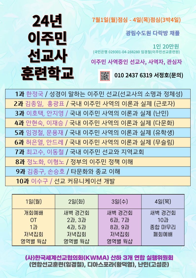 이번에 열리는 이주민선교사훈련학교는 KWMA 산하 연합선교훈련위원회(위원장 임경철 목사), 디아스포라위원회(위원장 황덕영 목사), 난민위원회(위원장 고성준 목사)가 연합해 운영할 예정이다.