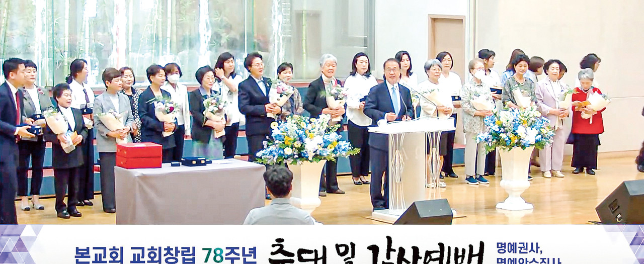이날 본교회는 주일 3부 예배를 통해 추대식을 거행하고 김광자 김영윤 김정 씨 등 12명을 명예권사로, 김홍근 윤석종 씨를 명예안수집사로 추대했다.