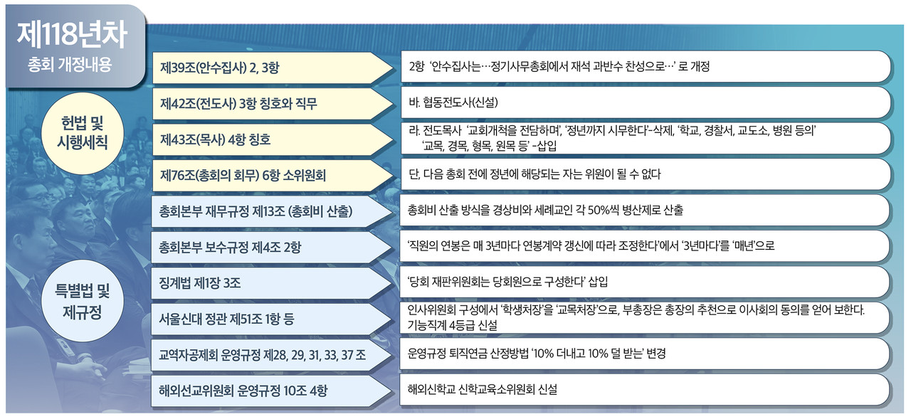 제118년차 총회에 ‘타당하다’로 상정한 개정안 26건 중 4건이 본지 관련 개정안이었는데, 치열한 공방 끝에 표결에 들어가 4건 모두 부결됐다. 이 밖에 1건을 제외하고는 ‘타당하다’로 상정된 안건은 모두 이견없이 통과됐다.