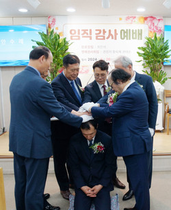 최훈조 원로목사는 이날 안수위원으로 참여해 아들 장로에게 안수했다.