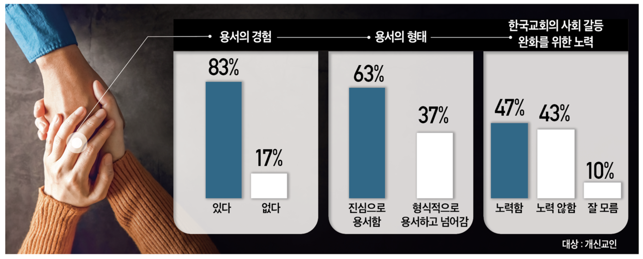 목회데이터연구소(대표 지용근, 이하 목데연)가 최근 발표한 ‘갈등과 용서 및 화해에 대한 개신교인 인식 조사’에 따르면, 개신교인 3명 중 1명은 ‘용서가 크리스천다운 삶이어서 용서했다’고 답했다.