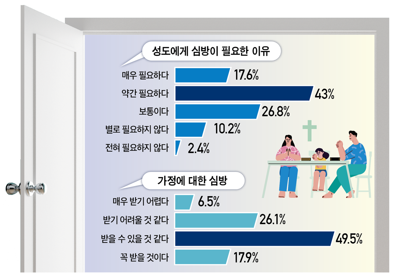 이번 조사에서 목회 돌봄과 직접적으로 연관된 평신도의 심방과 상담, 목양에 대한 욕구를 살펴보면, 심방을 원하지 않는 비율이 60.7%로 높게 나타나긴 했지만 심방의 필요성에 대해서는 공감하는의견도 적지 않았다. 가정 심방을 원하는 비율은 67.4%, ‘성도에게 심방이 필요하다’고 생각하는 응답 역시 60.6%로 나타나 ‘심방이 필요 없다’고 응답한 12.6%보다 현저하게 높았다.