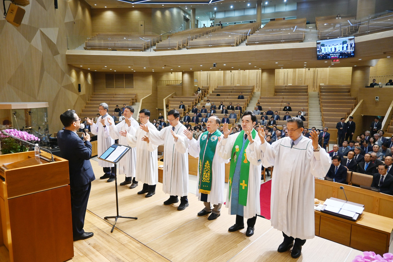 백 목사의 인도로 총회임원들이 단상에 올라 무릎을 꿇고 회개와 참회의 기도를 드렸다. 전 총회장들이 무릎 꿇은 총회임원들의 머리에 손을 얹고 118년차 총회를 이끌어갈 수 있는 지혜와 힘을 달라고 간절히 기도했다.