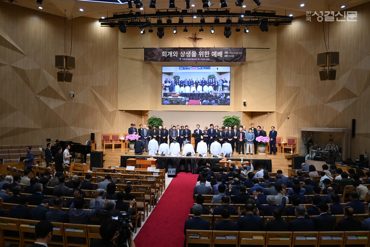 인천동지방회 목사중창단이 경배와 찬양을 맡아 회게예전의 시작을 이끌었다. 제118년차 성결교회 회개 기도성회에서 '회개와 회복'이라는 제목으로 말씀을 전한 전 총회장 이정익 목사. "주님의 평화"라고 서로 인사하며 평화의 인사를 나누고 있는 회개 기도성회 참석자들. 사진은 류승동 총회장을 격려하고 있는 전 총회장 이정익 목사의 모습. 회개와 상생 기도회 시간에 회개, 상생, 도약을 위해 간절히 기도하고 있는 제118년차 총회 임원단과 교단 관계자들. 제118년차 총회 임원단을 시작으로 회개 기도성회에 참석한 교단 관계자들 모두 회개와 상생을 통해 새로워질 성결교회를 기대하며 간절히 기도했다. 제118년차 총회 임원단이 단 위에 올라 회개의 기도를 드리고 있다. 제118년차 총회 임원단이 무릎꿇고 회개의 기도를 드렸다. 왼쪽부터 노성배 부총회장, 류승동 총회장, 안성우 부총회장. 류승동 총회장을 비롯해 총회 임원단은 회개와 눈물의 기도로 제118년차 총회의 시작을 알렸다. 무릎을 꿇고 회개의 기도를 드리고 있는 제118년차 총회 임원단과 전 총회장 및 부총회장들. 제118년차 총회 임원들이 전 정부총회장들 앞에 무릎꿇고 안수기도를 받았다. 총회 임원단과 제118년차 총회를 위해 전 총회장들이 안수기도하고 있는 모습. 총회 임원단과 제118년차 총회를 위해 전 총회장들이 안수기도하고 있는 모습. 총회 임원단과 제118년차 총회를 위해 전 총회장들이 안수기도하고 있는 모습. 평신도 기관장들도 회개와 상생의 예배에 참석해 뜨겁게 통성기도로 회개했다. 평신도 기관장들도 회개와 상생의 예배에 참석해 뜨겁게 통성기도로 회개했다. 사진은 전국권사회 직전회장 홍필현 권사가 기도하는 모습. 기도성회 참석자들은 회개와 상생의 기도로 성결교단의 도약을 위해 통성으로 간절히 기도했다. 제118년차 성결교회 회개 기도성회에서는 성찬을 중심으로 펼쳐진 상생예전을 통해 사중복음으로 온 세계를 복음화하는 일에 앞장서는 성결교회가 되겠다고 다짐했다. 초대교회 성례전이 엄숙한 가운데 거행됐다. 사진은 류승동 총회장이 한기채 전 총회장에게 떡을 떼어주는 모습. 엄숙한 가운데 거행된 초대교회 성례전. 사진은 장로 부총회장 노성배 장로가 배종위원으로 섬기고 있는 모습. 엄숙한 가운데 거행된 초대교회 성례전. 사진은 목사 부총회장 안성우 목사와 회계 문형식 장로 배종위원으로 섬기고 있는 모습. 성찬을 마친 후 회개와 상생으로 무장해 세상 속으로 나가 빛과 소금의 삶을 살기로 다짐하고 있는 회개 기도성회 참가자들. 제118년차 성결교회 회개 기도성회에서 축도를 하고 있는 전 총회장 이신웅 목사.