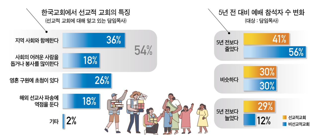실제로 한국적 상황에서 선교적 교회의 특징을 묻는 질문에는 지역사회와 함께 한다는 응답이 36%로 가장 많았으며 이어 영혼구원에 초점이 있다(26%), 사회의 어려운 이웃을 돕거나 봉사한다(18%), 해외선교사 파송에 역점을 둔다(18%) 등을 특징으로 선택했는데, 절반 이상이 지역사회와의 관계성을 중요하게 인식하고 있는 것으로 나타났다.