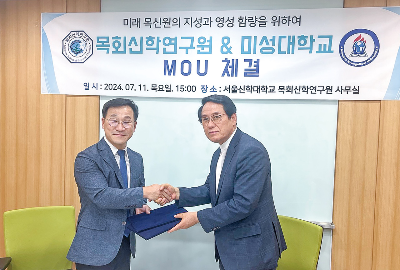 목회신학연구원(원장 조종환 목사)과 미성대학교(총장 이상훈 박사, America Evangelical University, AEU)가 지난 7월 11일 업무협약(MOU)을 맺고 미래 사역자 양성에 협력기로 했다.