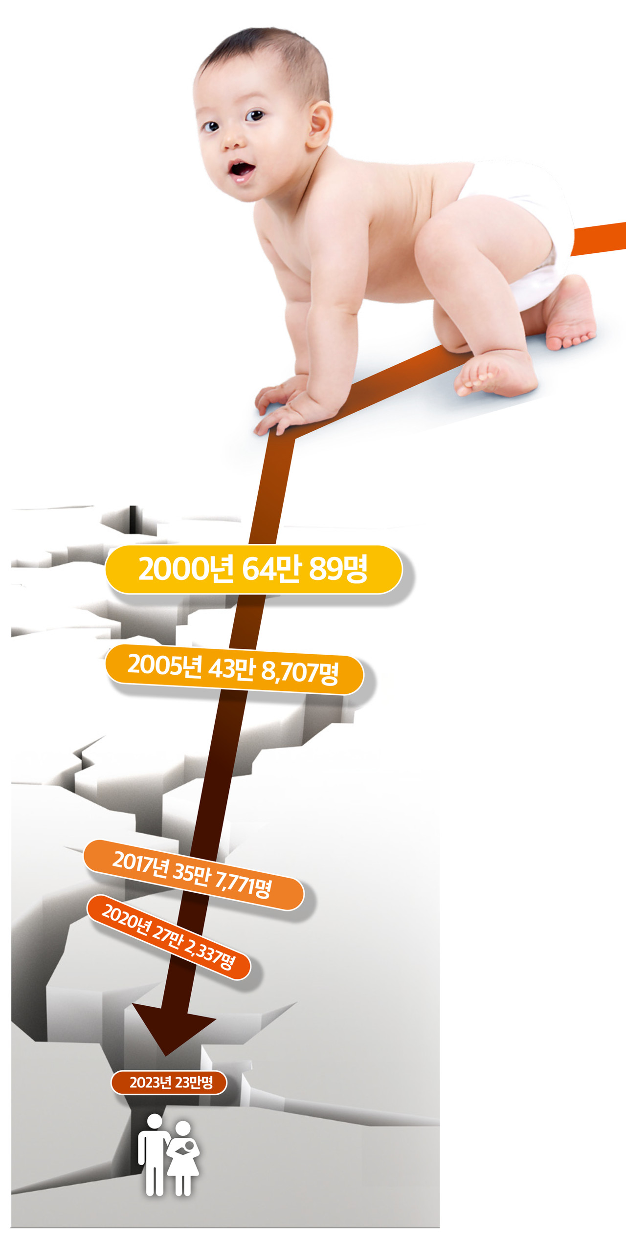 문제는 줄어들고 있는 속도다. 지난해 분기별로 보면 1분기 0.82명, 2분기 0.71명, 3분기 0.71명에서 4분기 0.65명으로 0.7명대까지 붕괴됐다. 신생아 수를 비교하면 2012년에는 48만 4,600명을 기록했지만 2023년에는 23만 명으로 절반 이상 줄어든 것을 알 수 있다. 2020년에는 처음으로 사망자 수가 출생자 수보다 많아 인구가 자연 감소하는 ‘인구 데드크로스’를 맞이했다.