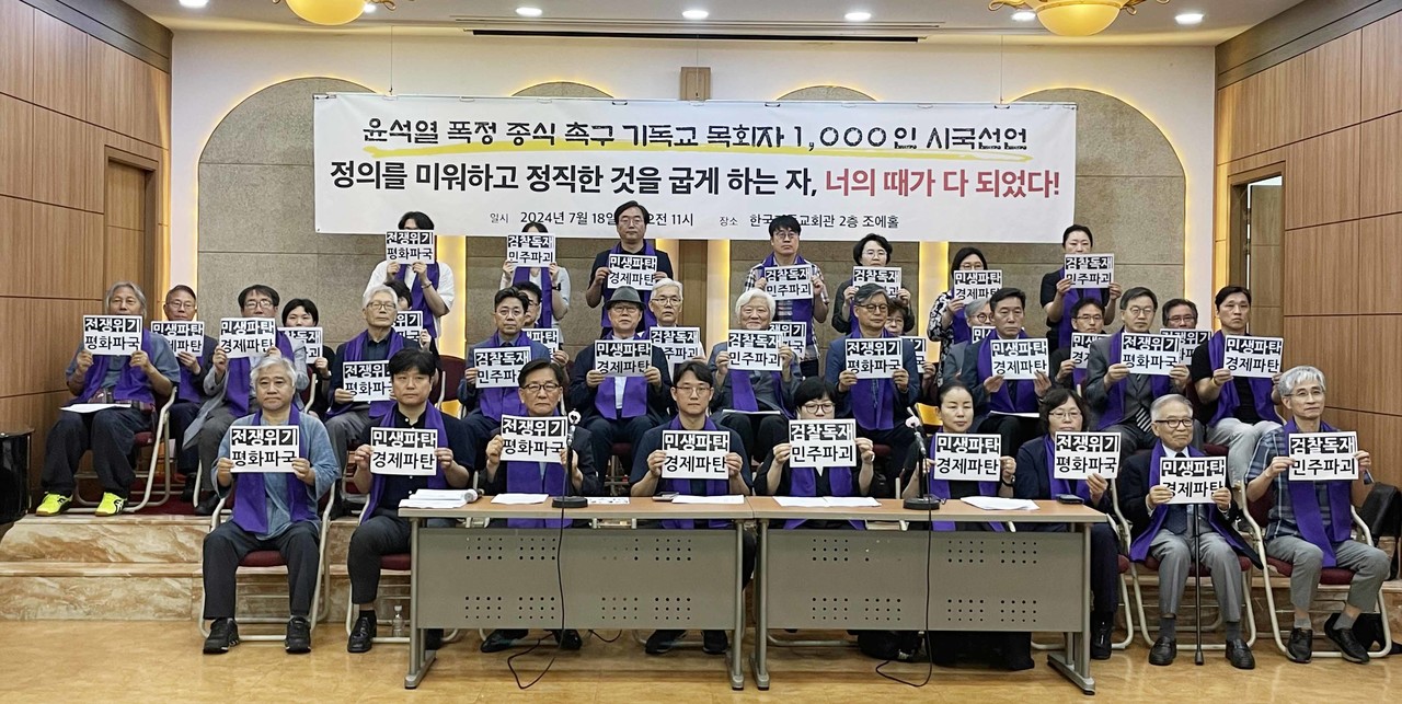 ‘채상병 1주기에 즈음한, 윤석열 폭정 종식 촉구 기독교 목회자 1004인 시국선언’ 발표 기자회견이 지난 7월 18일 서울 종로구 연지동 기독교회관에서 열렸다. 이들은 시국선언문을 통해 윤석열 대통령에게 자진사퇴를 권고하고, 이를 받아들이지 않을 시 국민의 준엄한 심판에 직면할 것이라고 경고했다.