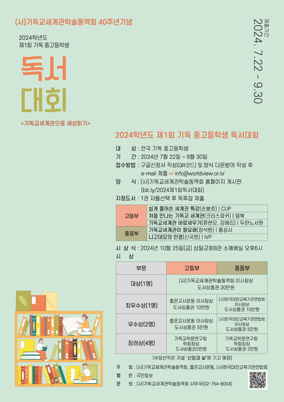 지정도서는 고등부 △쉽게 풀어쓴 세계관 특강(손봉호, CUP) △처음 만나는 기독교 세계관(크리스 파커, 템북) △기독교 세계관 바로 세우기(류현모·강애리, 두라노서원), 중등부 △기독교 세계관이 필요해(정석원, 홍성사) △니고데모의 안경(신국원, IVP) 등이다.