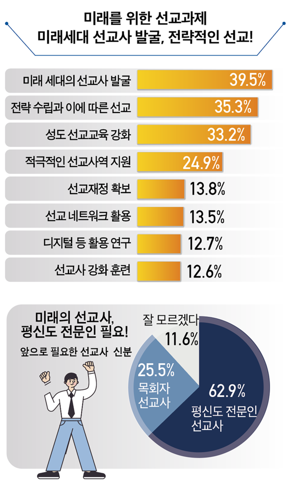 이 밖에 향후 바람직한 선교로 ‘교회개척과 제자화 사역’(40.6%) 다음으로 ‘비즈니스 선교’(16.5%)가 손꼽혔으며, ‘문화적 접근’(9.5%), NGO선교(6.8%)가 뒤를 이었다. 또한 미래 선교사는 목회자 선교사(25.5%)보다 ‘평신도 전문인 선교사’(62.9%)가 더 필요하다는 응답이 많았다.