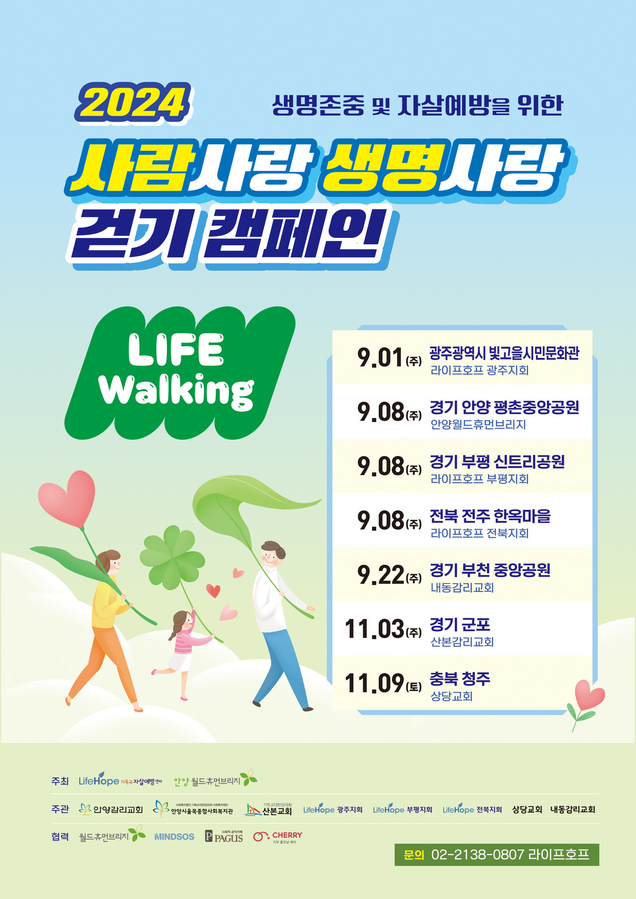 생명보듬 걷기 캠페인은 경기도 안양을 중심으로 부천, 광주, 전주, 부산 등 전국 10여 곳에서 ‘사람사랑 생명사랑’이라는 주제로 진행된다. 9월 8일 안양감리교회가 주최하는 안양 평촌공원 행사에는 김용 전 세계은행 총재와 최근 설립된 마인드풀커넥트(대표 류혜원)의 멘탈헬스 솔루션 브랜드 MINDSOS(마인드에스오에스)가 함께 한다.