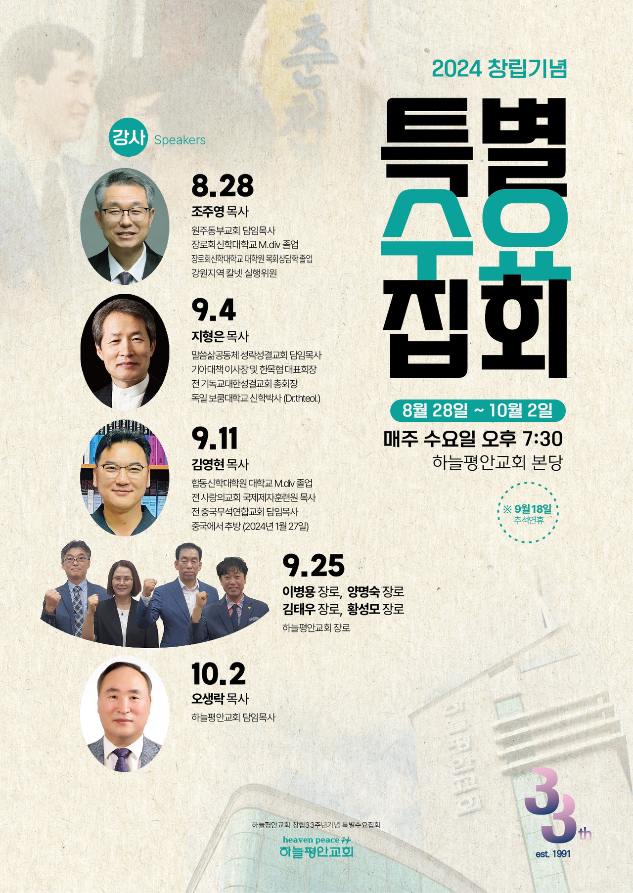 강원서지방 하늘평안교회(오생락 목사)는 창립 33주년을 기념해 8월 28일부터 10월 2일까지 특별수요집회를 개최한다.