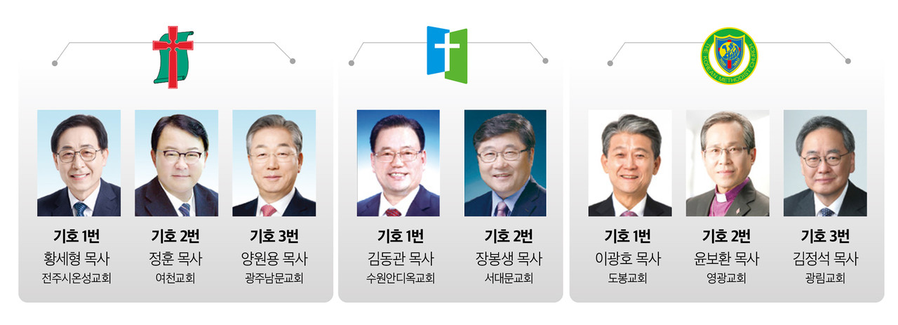 기독교대한감리회 감독회장 선거에는 기호 1번 이광호 목사(도봉교회), 기호 2번 윤보환 목사(영광교회), 기호 3번 김정석 목사(광림교회)가 출사표를 던졌다.