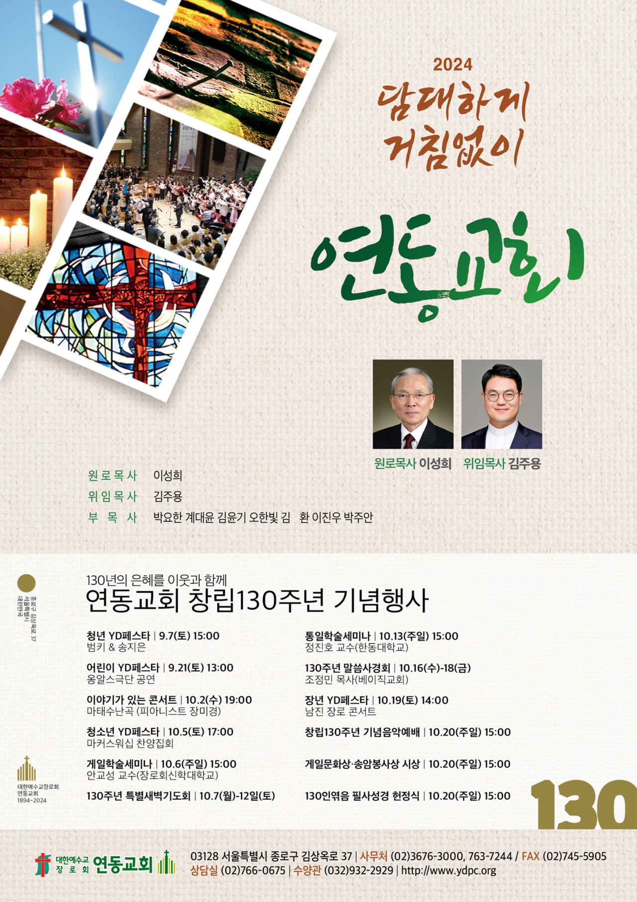 이외에도 △이야기가 있는 ‘마태수난곡’ 콘서트(10월 19일 오후 7시) △게일 학술세미나(10월 6일 오후 3시) △130주년 특별새벽기도회(10월 7~12일) △통일 학술세미나(10월 13일 오후 3시) △130주년 말씀사경회(10월 16~18일) 등이 진행되며 10월 20일에는 창립 130주년 기념음악예배, 게일문화상·송암봉사상 시상, 130인역음 필사성경 헌정식 등이 개최될 예정이다.
