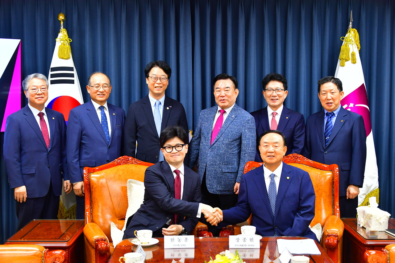 한동훈 국민의힘 대표가 9월 6일 취임 인사차 한국교회총연합(대표회장 장종현 목사, 이하 한교총)을 예방해 장종현 대표회장과 환담했다.