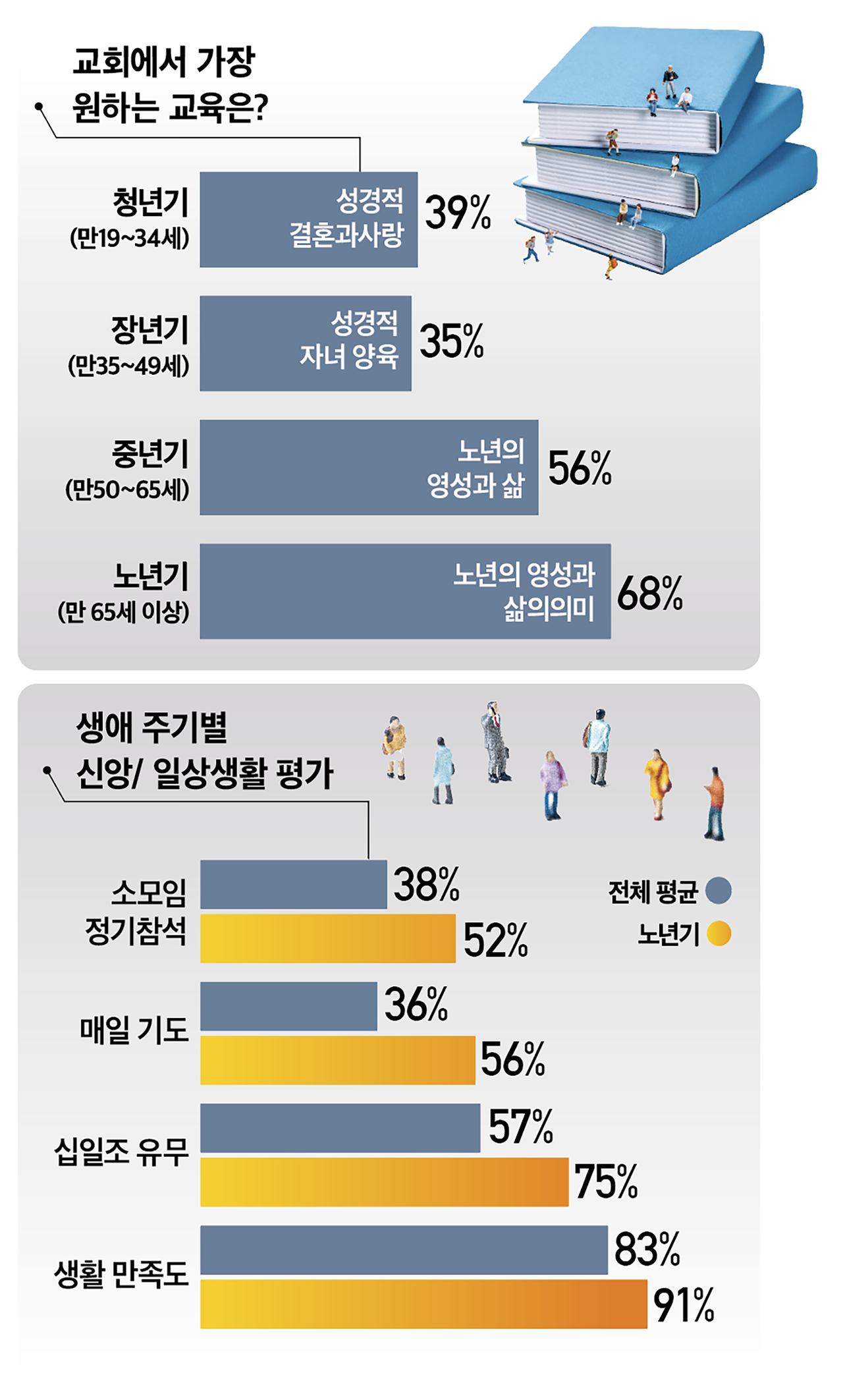 생애주기별 교육실태와 욕구를 묻는 질문에는 청년기는 성경적 결혼과 가정(39%), 성경적 일과 재정 관리(32%), 성경적 자녀 양육(22%) 순으로 응답했고 장년기는 성경적 자녀 양육(35%), 성경적 일과 재정 관리(34%), 성경적 결혼과 가정(29%), 중년기와 노년기는 노년의 영성과 삶의 의미가 각각 56%와 68%로 가장 많았다.