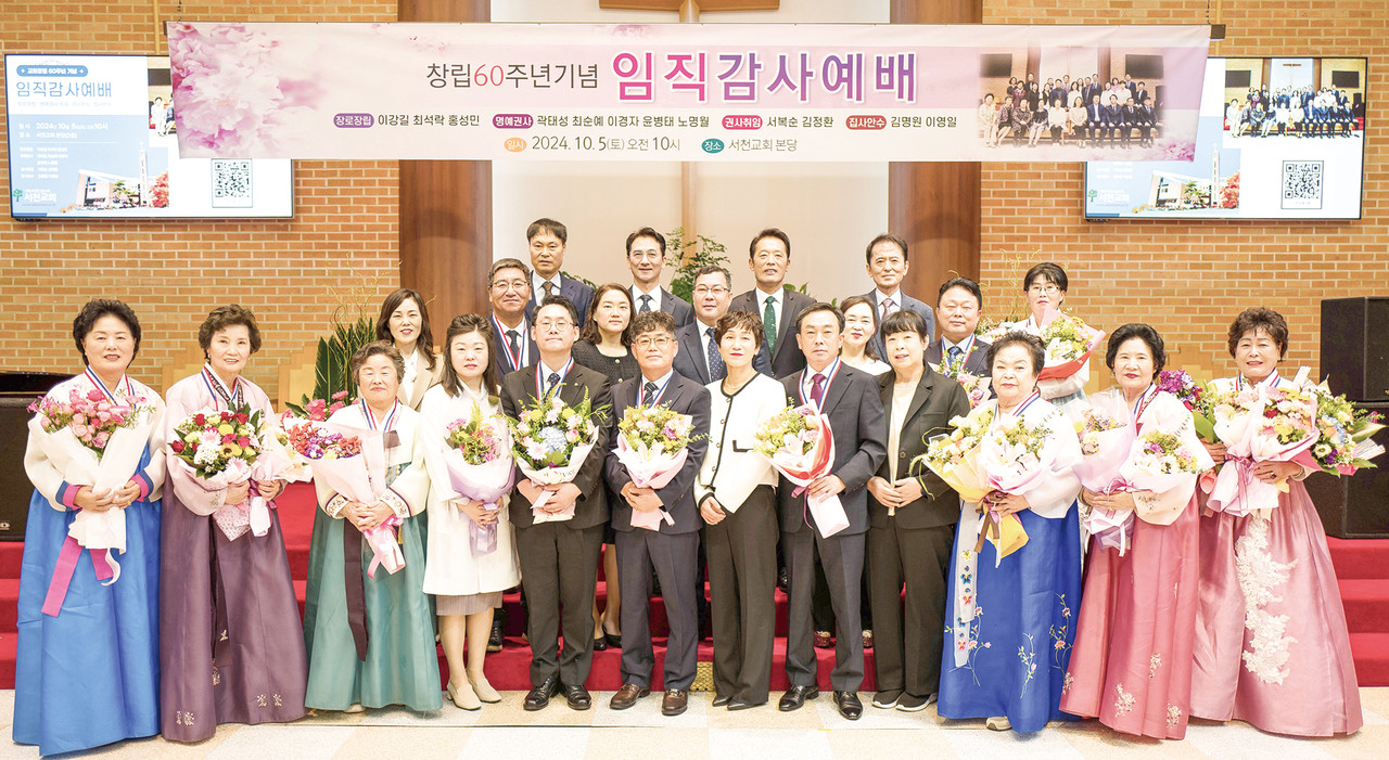 이날 서천교회는 60년 전통을 이어받아 교회 부흥을 이끌어갈 장로와 권사, 안수집사를 임명했다. 이강길 최석락 홍성민 씨가 장로로 장립했으며 서복순 김정환 씨가 권사로 취임, 김명원 이영일 씨는 집사로 안수받았다.