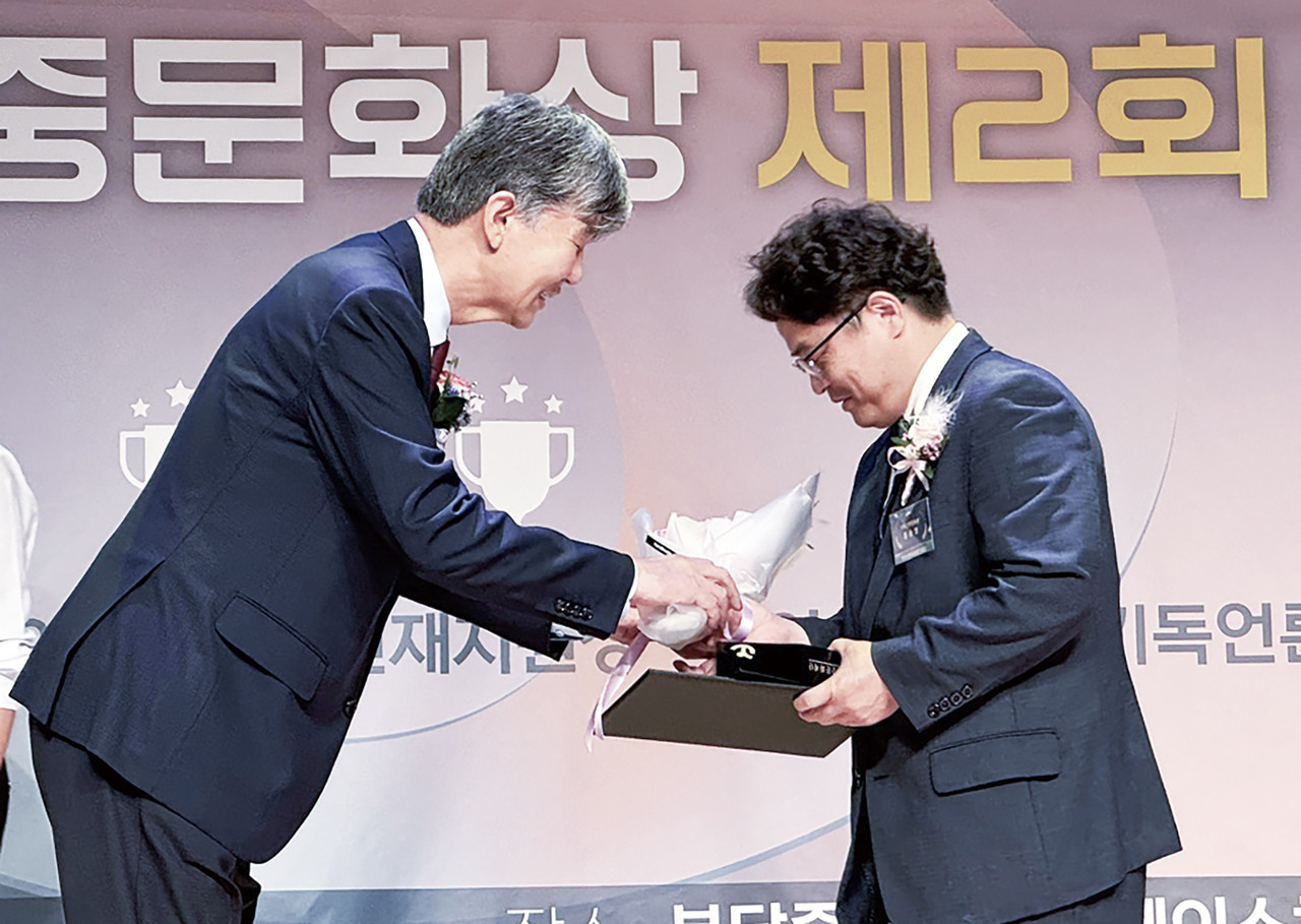 본지 편집국장 황승영 목사(사진 오른쪽)가 제2회 인류애실천분중문화상 시상식에서 기독언론문화상을 수상했다. 대상은 찬양사역자 박종호 장로가 받았다.