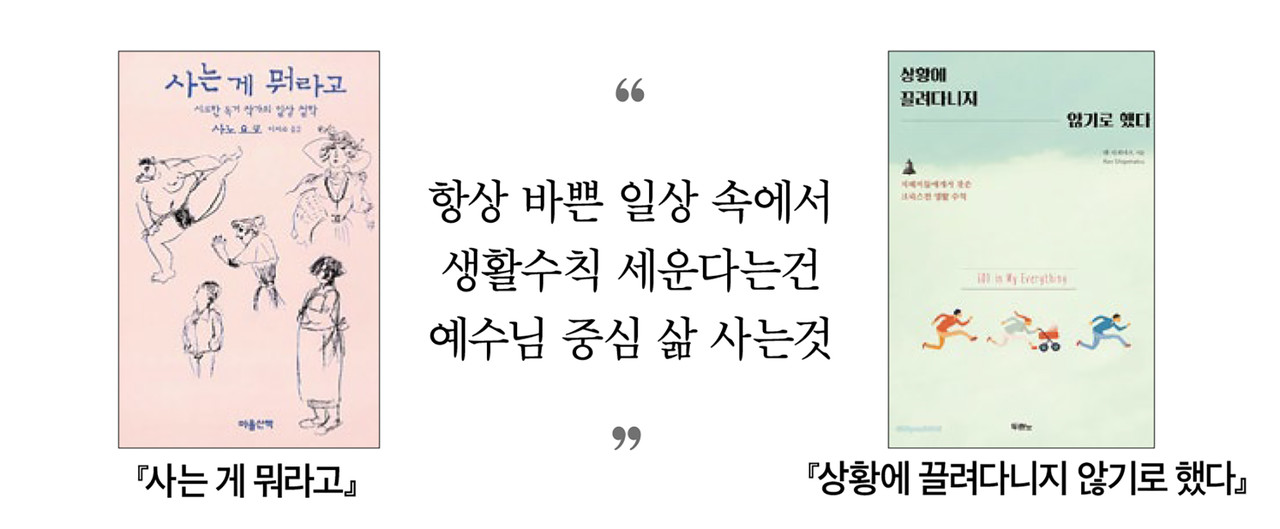 오늘 소개하는 일반서적은 사노 요코의 사는 게 뭐라고』이고, 신앙 서적은 켄 시케마츠의 상황에 끌려다니지 않기로 했다』입니다.