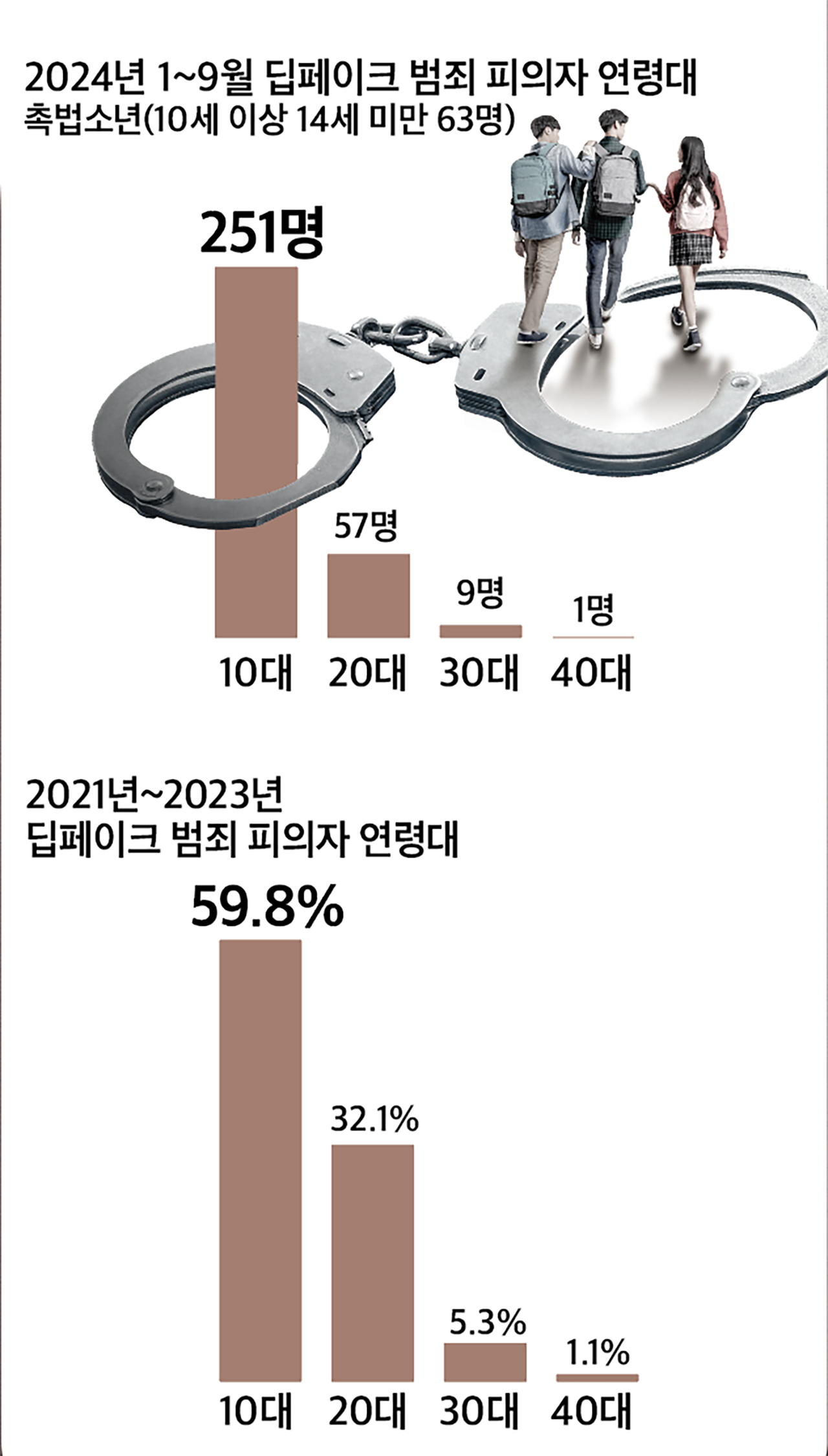 실제로 지난 9월 11일 경찰청의 발표에 따르면, 올해 1월 1일부터 9월 10일까지 딥페이크 성범죄로 검거된 피의자 10명 중 8명이 10대로 나타났다. 검거된 피의자 318명 중 10대는 251명(78.9%)으로, 이 중 63명은 만 10세 이상 만 14세 미만이라 형사 처벌을 받지 않는 ‘촉법소년’인 것으로 나타났다. 피의자 중 20대는 57명(17.9%), 30대 9명(2.8%), 40대는 1명(0.3%)이다.