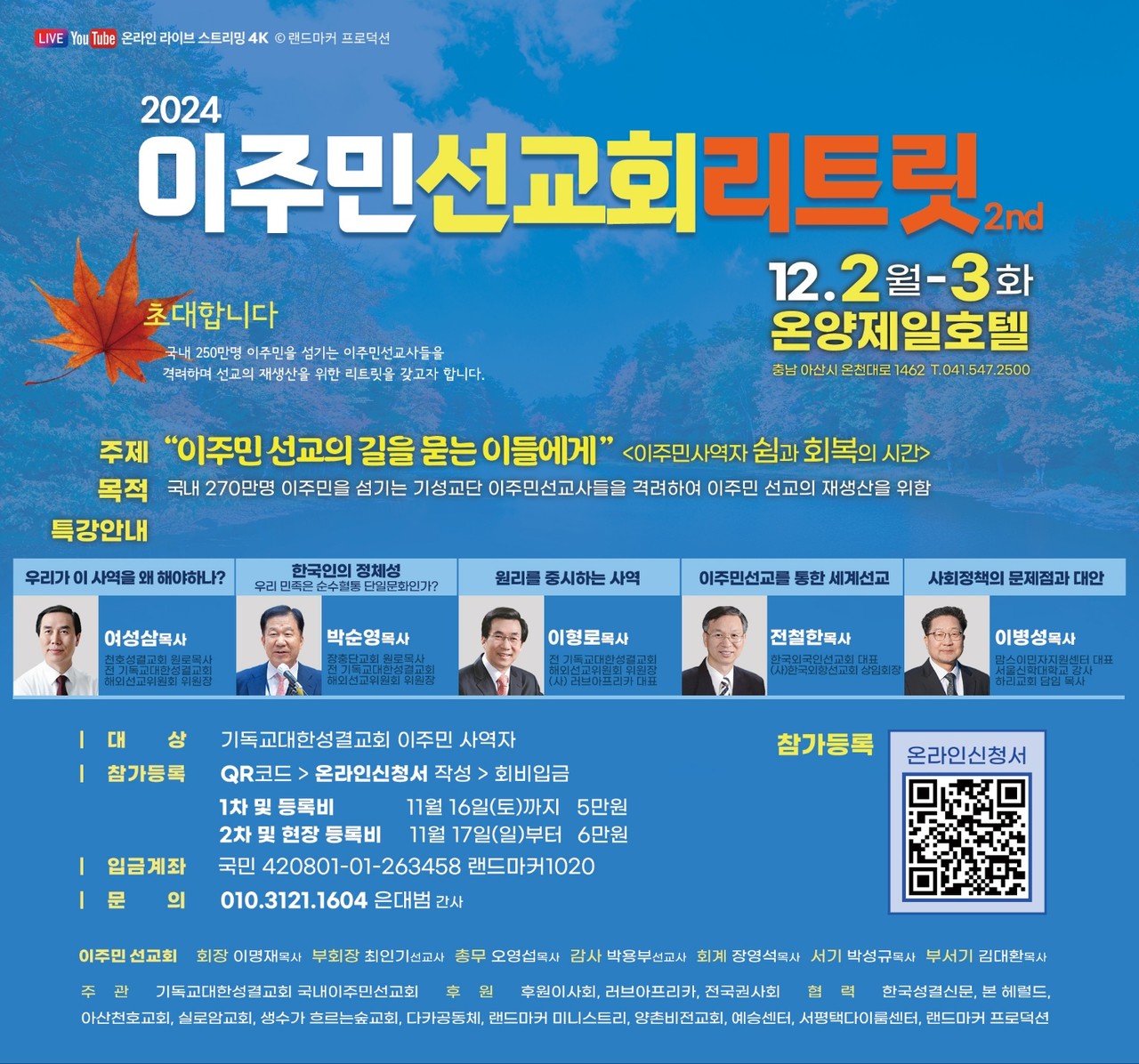 이번 리트릿에서는 뜨거운 예배와 기도, 목회자 네트워크 특강, Talk Concert 등의 프로그램으로 진행되며, 성결교단 이주민 사역자들이 한자리에 모여 서로의 사역을 나누고 격려하며, 이주민 선교의 미래와 더 효과적인 선교 재생산에 대한 방안들을 모색할 예정이다.