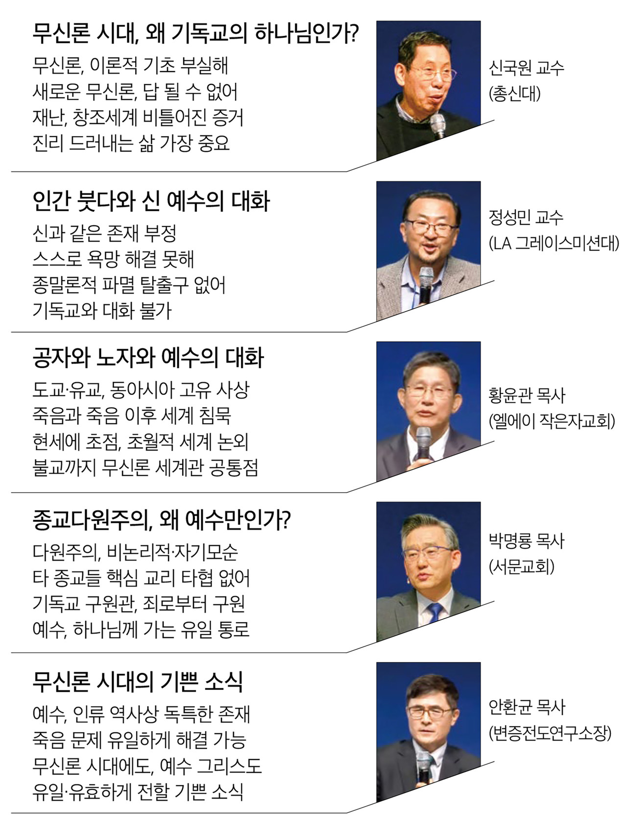 첫 강연에서 신국원 교수(총신대)는 무신론 시대 신의 존재를 부정코자 하는 논리를 반박했다. 그는 “사람들은 신을 부정하면서도 신을 대체할 무엇인가를 찾으며, 결국 스스로 또 다른 신의 영역을 만들어 내고 있다”면서 “이는 신의 공백을 메우지 못해 늘 불안에 시달리고 있다는 증거”라고 지적했다.