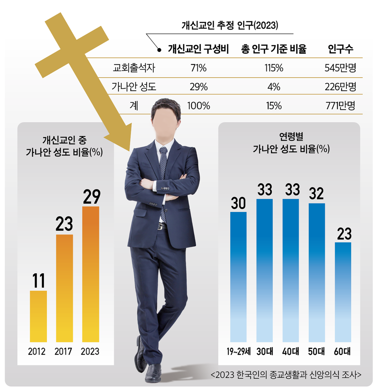 지난 예장통합과 합동 9월 총회에서 발표된 교세 현황에서 20만 명의 교인이 감소했다는 소식은 교단 안팎에서 적지 않은 충격을 줬다. 한국기독교목회자협의회가 2023년 1월 발표한 ‘2023 한국인의 종교생활과 신앙의식 조사’에서도 개신교 인구가 15%로 감소됐으며, 가나안 성도의 비율은 2012년 이후 11년간 3배 가까이 증가한 29%로 조사됐다. 교인 수는 꾸준히 줄어드는데, 그나마 교인 중 교회에 안나오는 가나안교인은 급증하고 있는것이다.