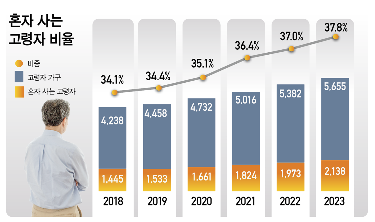 통계청 발표에 따르면 우리나라 가구주의 연령이 만 65세 이상인 고령자 가구는 총 565만 5,000가구이며 이중 혼자 사는 노인은 전체의 37.8%인 213만 8,000여 명이다. 연도별로 구분하면 만 65세 이상의 고령자 가구는 2015년 372만 가구에서 8년 새 565만 5,000가구로 35% 이상 늘었으며 1인 가구 수도 43% 가량 증가했다. 특히 고령자 가구 중 1인 가구 비중은 2015년 32.9%에서 지난 해 37.8%로 매년 늘어나는 추세이다.