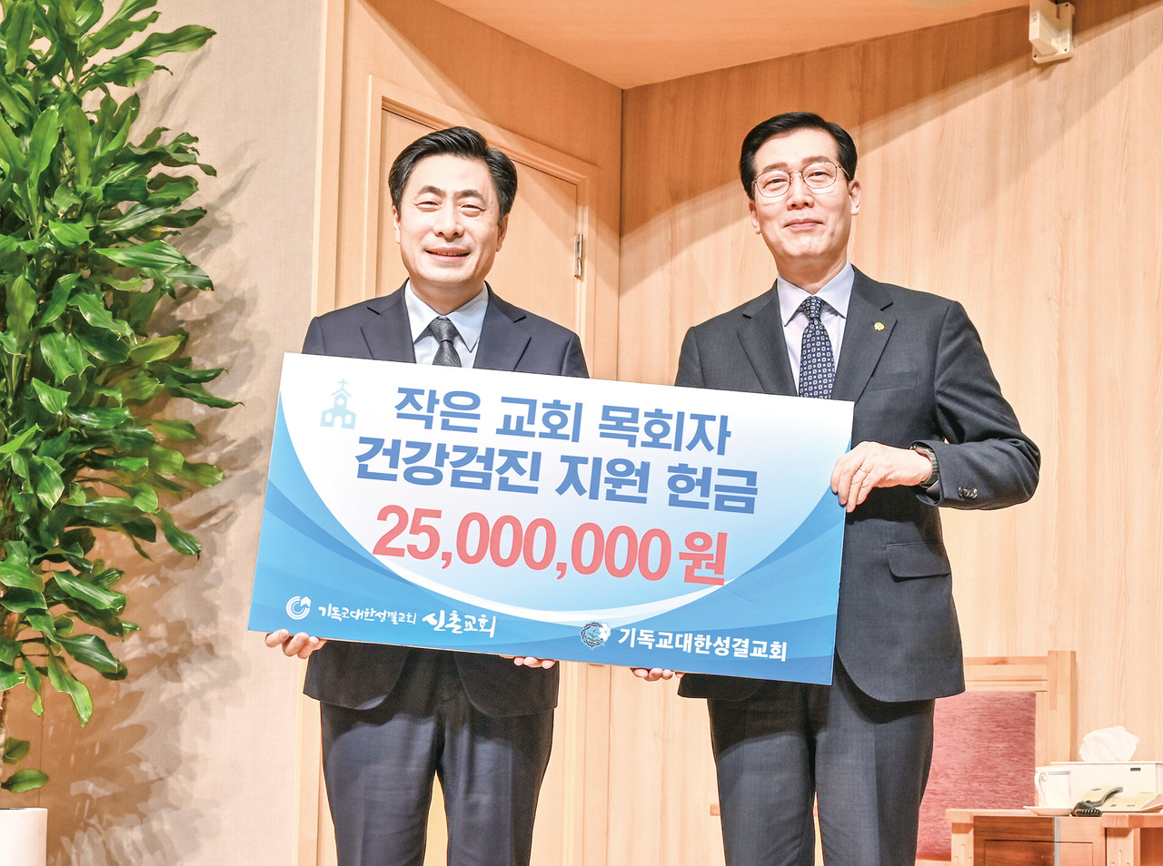 신촌교회(박노훈 목사)는 지난 11월 16일 추수감사절 특별새벽기도 마지막 날 교단 총무 문창국 목사를 초청해 작은교회 목회자 건강검진 지원금 2,500만원을 전달(사진)했다. 총회가 KMI와 협력해 작은교회 목회자 건강검진을 지원한다는 소식에 신촌교회가 앞장서 도움의 손길을 내민 것이다.