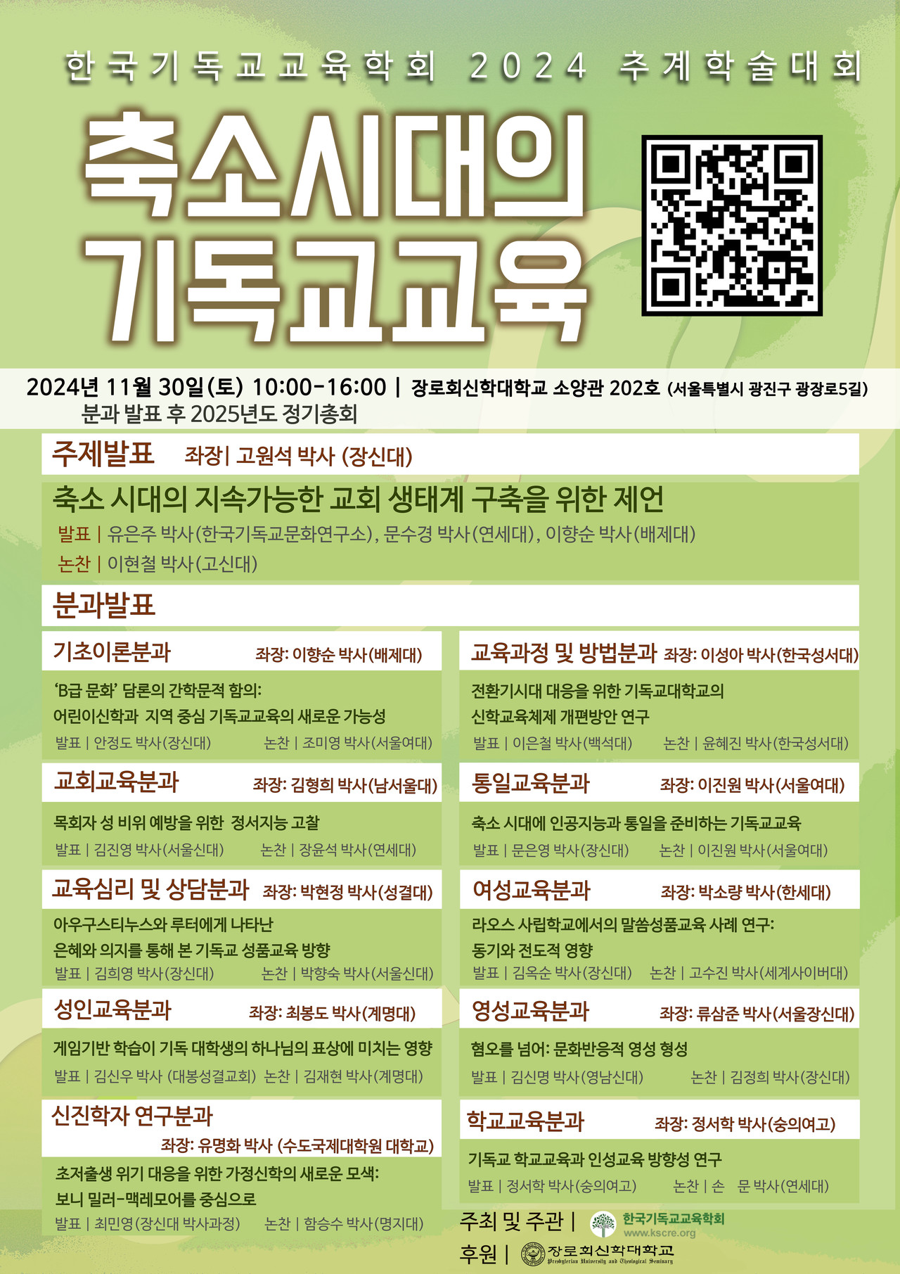 한국기독교교육학회(회장 장신근 교수)가 오는 11월 30일 오전 10시부터 오후 4시까지 서울시 광진구 소재 장로회신학대학교 소양관에서 ‘축소시대의 기독교교육’을 주제로 2024년 추계학술대회를 개최한다.